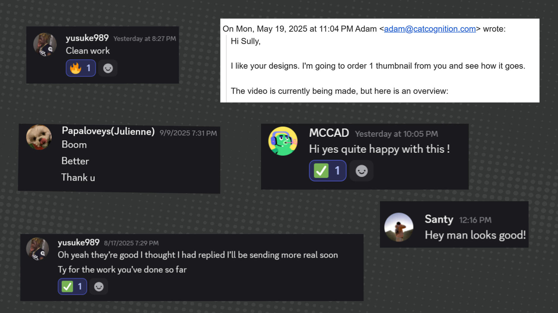 I'm SULLY, I’ve spent countless hours mastering thumbnail design, helping people bring their ideas to life, while also improving their CTR by 40-60%